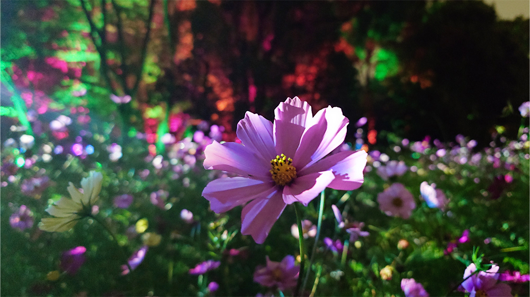 闇の中で咲き、輝くコスモスは、人々が近くで立ち止まると、